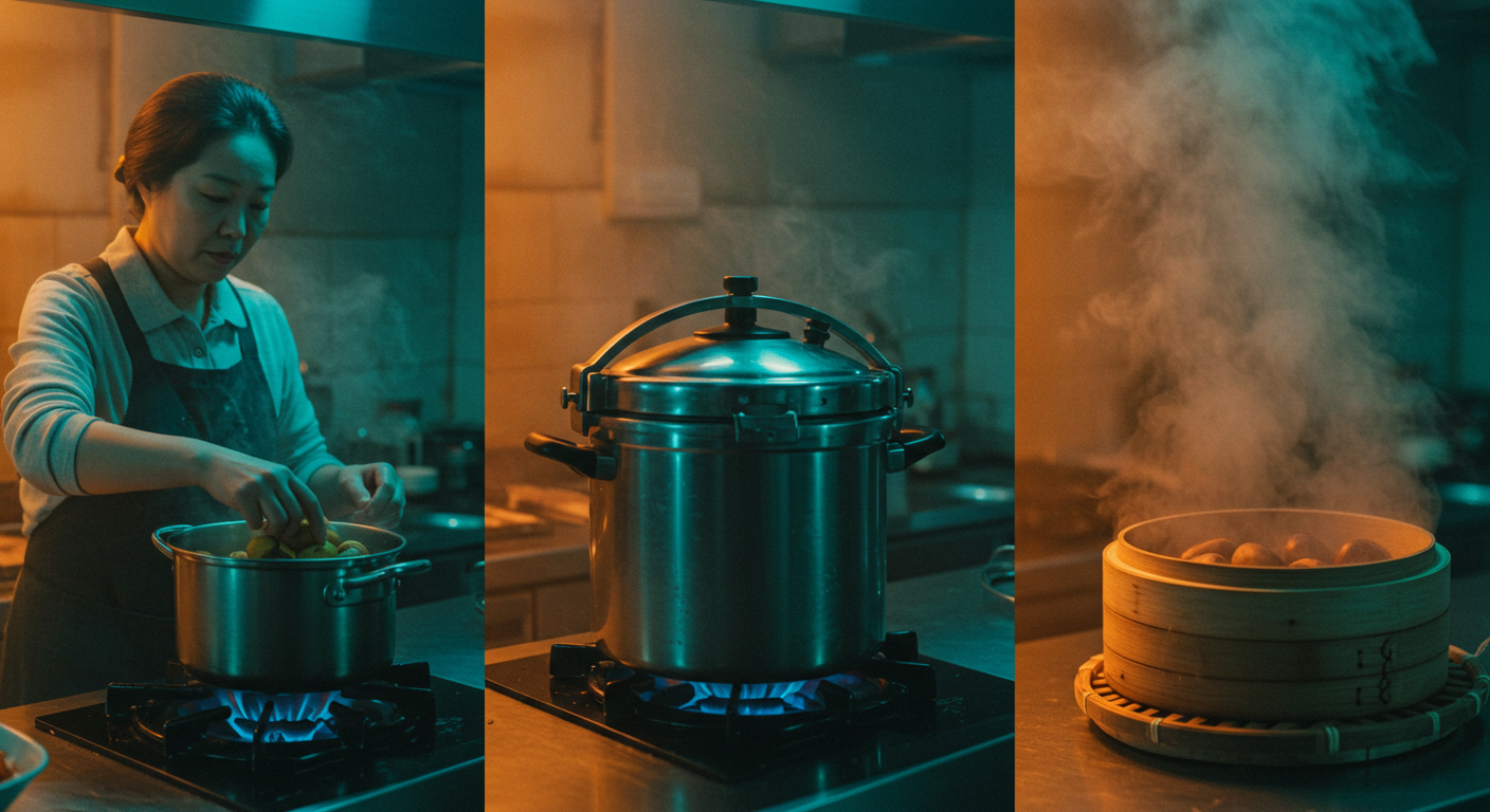 압력솥은 빨라요. 밤이 반 잠길 만큼 물 붓고, 추가 흔들리면 7분~10분 삶은 뒤 뜸 들이면 끝! 짧은 시간에 부드러운 밤을 맛볼 수 있답니다.